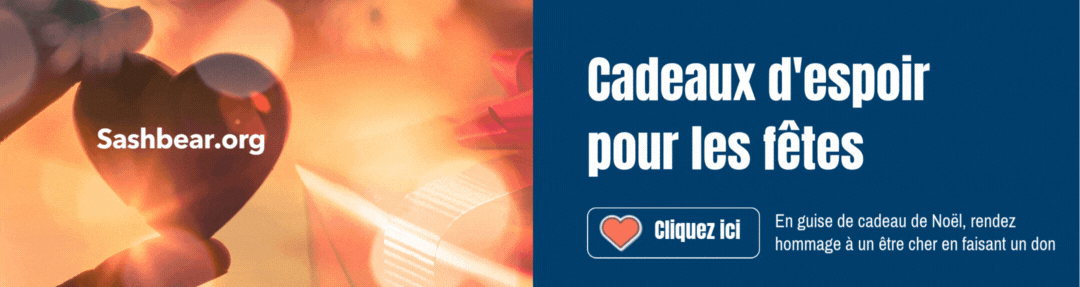 Chaque dollar que vous donnez à Sashbear sert à fournir des compétences, du soutien et de l’espoir aux familles et amis de personnes souffrant de dysrégulation émotionnelle, pour les aider à rétablir l’équilibre dans leur vie. Organisme de bienfaisance enregistré, La Fondation Sashbear compte sur la générosité de personnes comme vous pour poursuivre son œuvre. Faites une différence aujourd’hui en faisant un don à Sashbear.